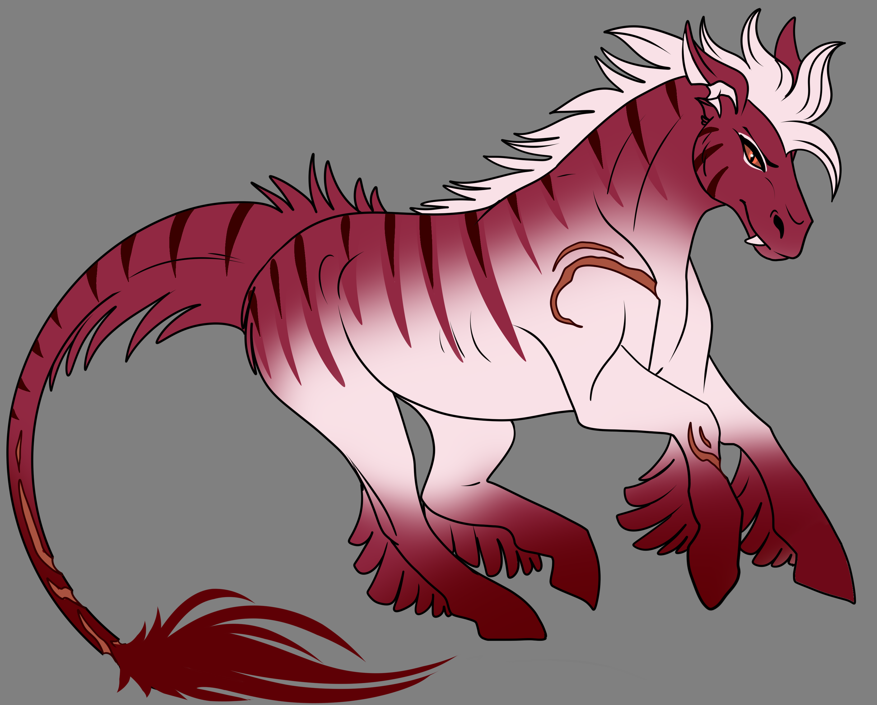 Freshwater kelpies are mostly of white and red shades ; they have medium-sized impermeable fur, ideal for a creature alternating between land and water. The major characteristic of their coats is their red stripes which can have various shapes and placement over their body. They are mostly strongly built, similar to draft horses, and despite spending most of their time in the water, they have no problem evolving on land as well, especially when it comes to hunting. There is no visible dimorphism between males and females kelpies.