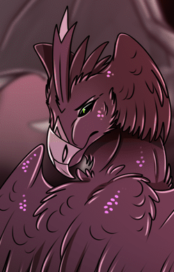 Gotty is an adult pegasus with a dark purple and greyish coat, with a light purple iridescence. His feathers have a particular ribbon shape - his beak is damaged on the right side. He has greenish-yellow pupils, depending on the light. His tail is very similar to a rooster's.